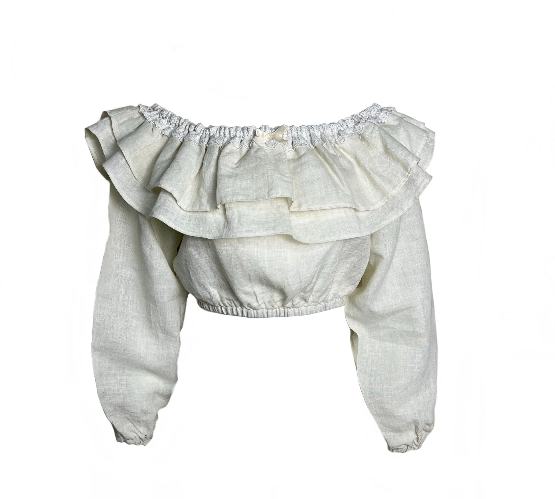 This 100% Linen blouse can be worn on or off shoulder. It features an oversized sleeve and two large ruffles that drape beautifully throughout the neckline. Finished with cotton lace and satin bow.
