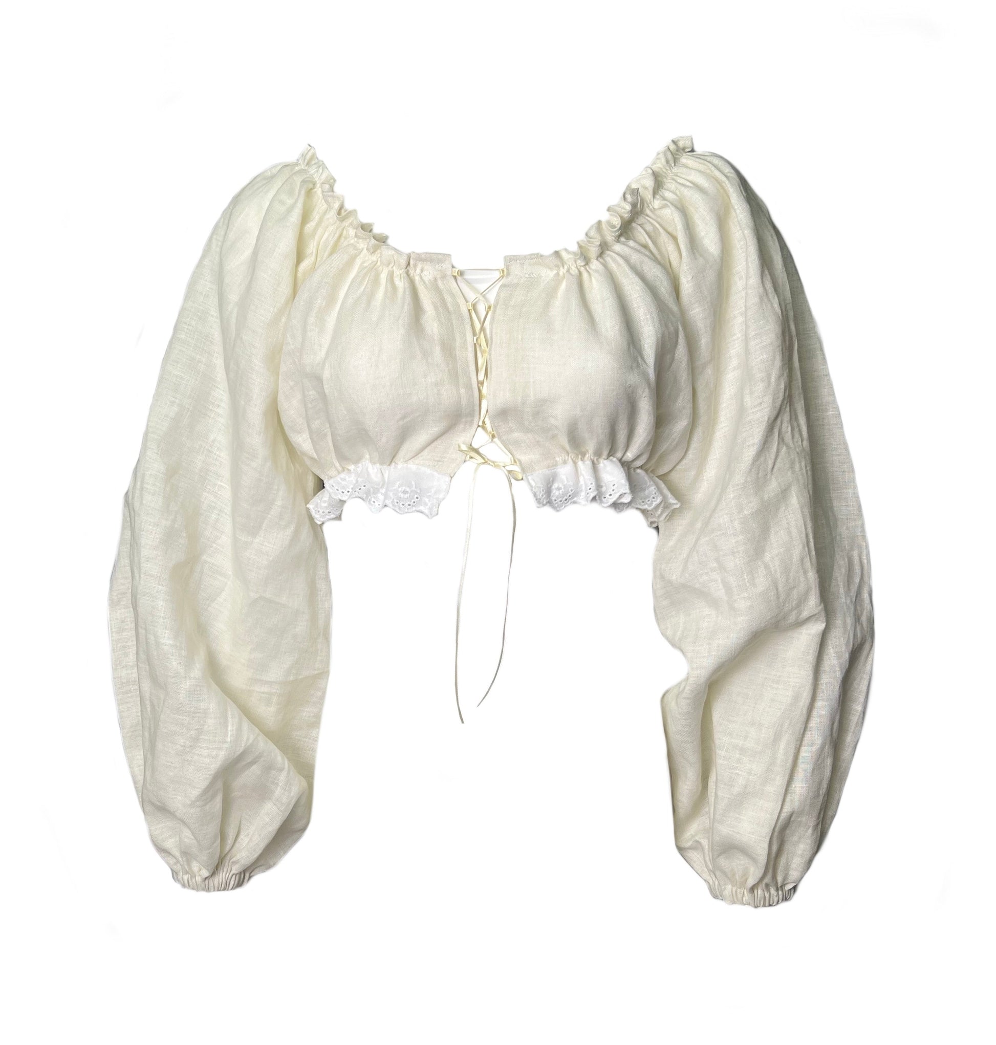 The Helena top is an elegant and versatile statement piece that features a balloon sleeve, laced front tie closure, and ruffles throughout the neckline and waist. Made with 100% Linen, picot edge elastic, and satin ties. Each blouse is made to order with love.