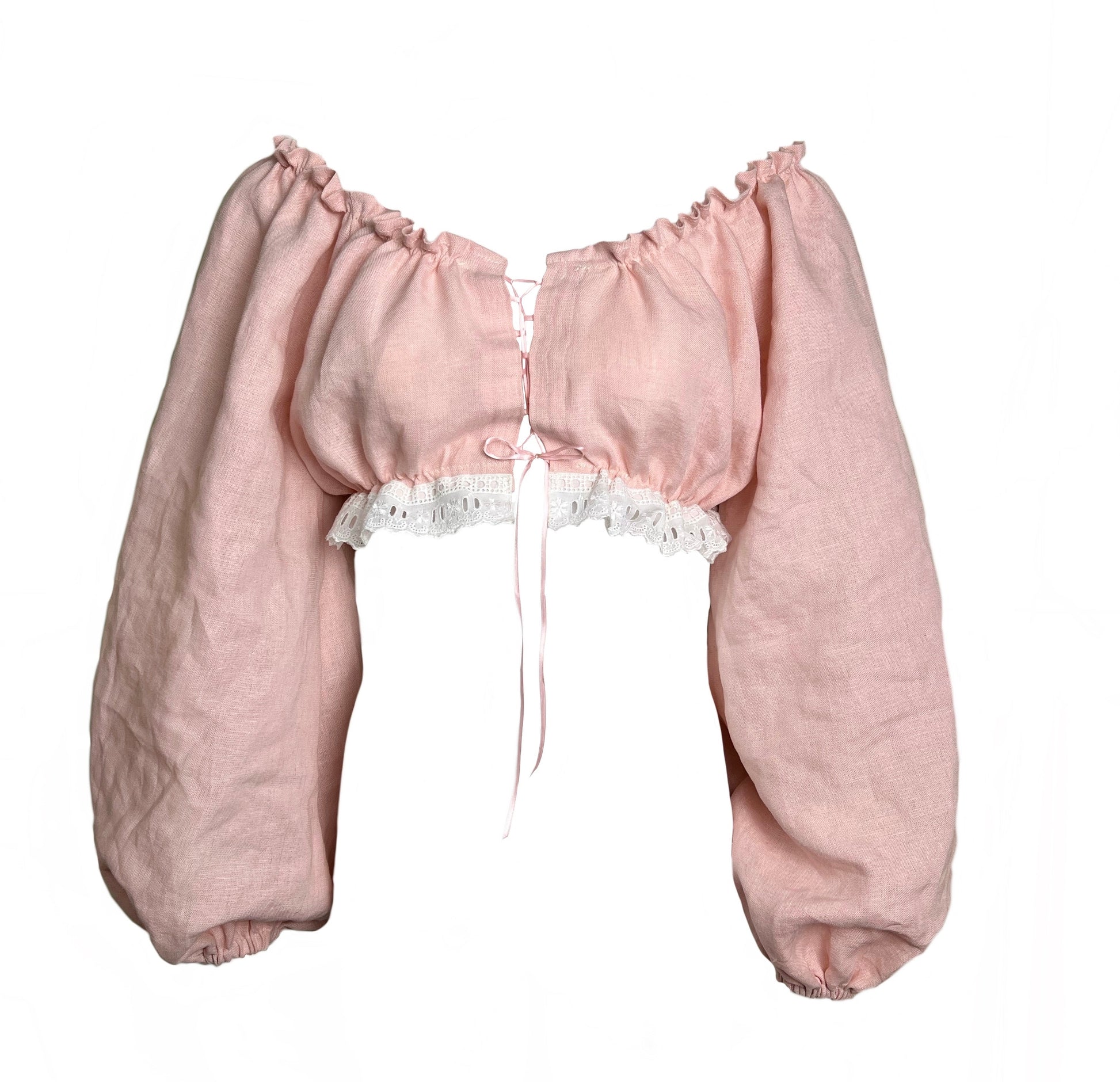 The Helena top is an elegant and versatile statement piece that features a balloon sleeve, laced front tie closure, and ruffles throughout the neckline and waist. Made with 100% Linen, picot edge elastic, and satin ties. Each blouse is made to order with love.